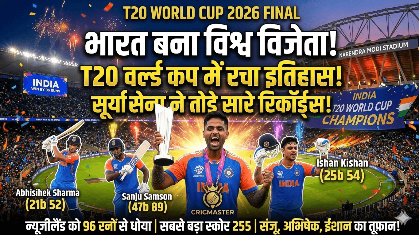🏆 टी20 वर्ल्ड कप 2026 फाइनल 🏆 नरेंद्र मोदी स्टेडियम, अहमदाबाद INDIA 🇮🇳 255/5 (20.0 ओवर) VS NZ 🇳🇿 159/10 (19.0 ओवर) परिणाम: भारत 96 रनों से जीता! 🇮🇳 🎖️ प्लेयर ऑफ द मैच: जसप्रीत बुमराह 🥇 प्लेयर ऑफ द सीरीज: संजू सैमसन Powered by cricmaster.in IND vs NZ Final :अहमदाबाद, 9 मार्च 2026: नरेंद्र … Read more